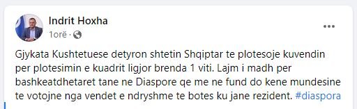 Lidhur me këtë ka reaguar Sekretari për Diasporën në PD Indrit Hoxha. Ai shkruan se “Gjykata Kushtetuese detyron shtetin Shqiptar të plotësojë Kuvendin për plotësimin e kuadrit ligjor brenda 1 viti. Lajm i madh për bashkëatdhetarët tanë në Diasporë që më në fund do kenë mundësinë të votojnë nga vendet e ndryshme të botës ku janë rezident.”
