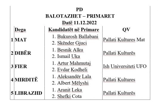 Partia Demokratike do të zhvillojë sot raundin e dytë të primareve. Siç bëhet me dije përmes një njoftimi për mediet, këtë të dielë do të votohet për kandidatët e dalë në balotazh në pesë bashki: Mat, Dibër, Fier, Mirditë dhe Librazhd. Në fakt janë 6 bashki që shkuan në balotazh, por gara në Fushë-Arrëz është shtyrë për një datë tjetër.