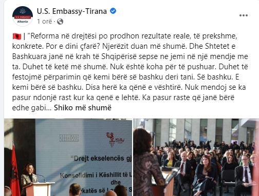 Në mesazhin e publikuar nga ambasada, Kim ndalet tek reforma në drejtësi që sipas saj po prodhon rezultate konkrete dhe të prekshme. Por thekson se nuk është koha për pushim dhe duhet bërë akoma më shumë.