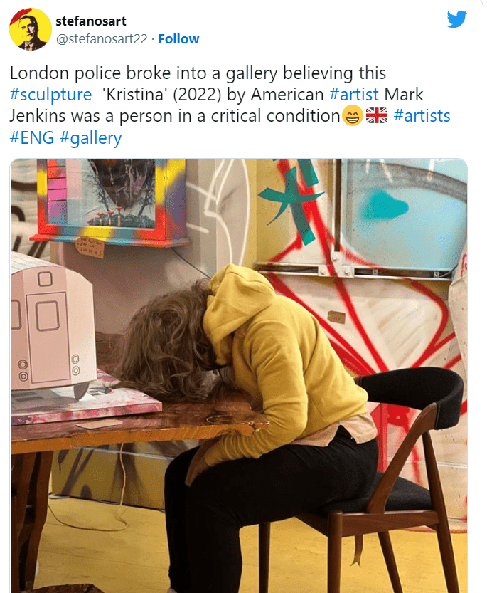 Policia në Londër bastisi një galeri arti në pronësi të ish-agjentit të Banksy pasi ngatërruan një skulpturë tejet realiste të një gruaje të pavetëdijshme, për një trup të vërtetë, sipas Artnet Neës. Oficerët supozuan se modelja kishte pësuar një atak në zemër, tha një punonjës i galerisë.
