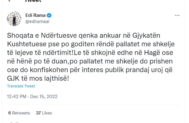 “Shoqata e Ndërtuesve qenka ankuar në Gjykatën Kushtetuese pse po goditen rëndë pallatet me shkelje të lejeve të ndërtimit! Le të shkojnë edhe në Hagë ose në hënë po të duan, po pallatet me shkelje do prishen ose do konfiskohen për interes publik prandaj uroj që GJK të mos lajthisë!”- shkruan Rama.