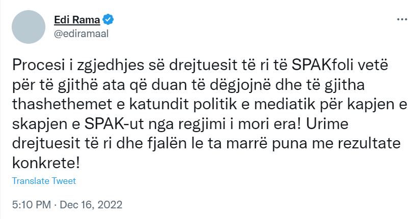 “Procesi i zgjedhjes së drejtuesit të ri të SPAK foli vetë për të gjithë ata që duan të dëgjojnë dhe të gjitha thashethemet e katundit politik e mediatik për kapjen e s’kapjen e SPAK-ut nga regjimi i mori era! Urime drejtuesit të ri dhe fjalën le ta marrë puna me rezultate konkrete!” – shkruan Rama.