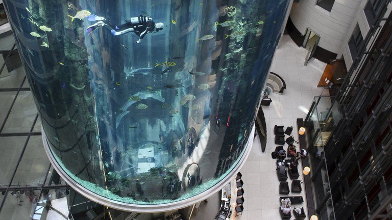 ‘AquaDom’ në hollin e hotelit ‘Radisson Blu’ konsiderohej si akuariumi cilindrik më i madh i lirë në botë.