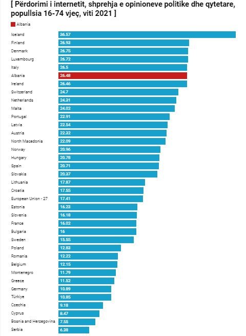 Sipas Eurostat, 26.5% e përdoruesve shqiptarë të internetit të moshës nga 16 deri në 74 vjeç e përdorin internetin për shprehjen e opinioneve për çështjet politike apo qytetare në faqe interneti e rrjete sociale, gati 10 pikë përqindje më e lartë sesa mesatarja e Bashkimit Europian.