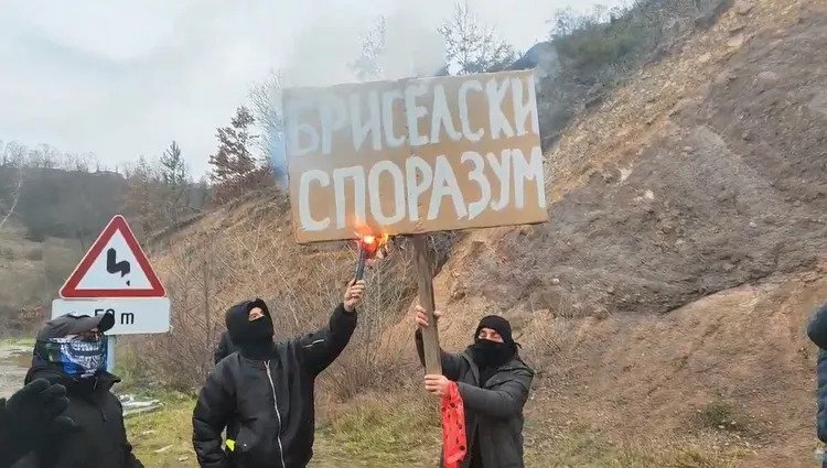 Protestuesit e mbledhur në anën serbe të kufirit dëgjohen duke kënduar këngë kundër Kosovës ndërsa thërrasin ‘Kosova është zemra e Serbisë’ duke djegur një pankartë ku shkruhet ‘Marrëveshja e Brukselit’.