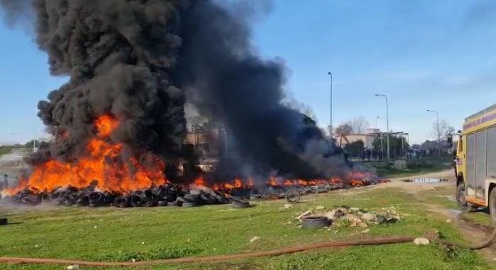 Zjarri u shfaq pranë hidrovorit dhe si pasojë e përhapjes së flakëve po digjen disa goma automjetesh.