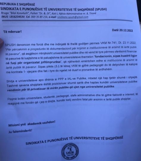 Sindikata e pedagogëve ka shprehur kundërshtinë lidhur me vendimin e qeverisë më 23 nëntor sipas të cilit, universitetet publike mund të shndërrohen në institucione publike të pavarura.