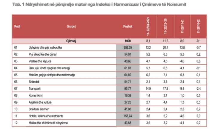 Sipas INSTAT, Ndryshimi vjetor i matur nga Indeksi i Harmonizuar i Çmimeve të Konsumit në muajin Nëntor 2022 është 8,0 %, në nivele të njëjta me muajin e mëparshëm. Rritja më e madhe e çmimeve prej 13,8 % vërehet në grupin “Ushqime dhe pije joalkoolike”, pasuar nga grupet “Transporti” me 9,4 %, “Mobilim, pajisje shtëpie dhe mirëmbajtje” me 6,3 %, “Pije alkoolike dhe duhan” me 5,5 %, “Veshje dhe këpucë” dhe “Hotele, kafene dhe restorante” me 4,6 % secili, “Qira, ujë, lëndë djegëse dhe energji” dhe “Mallra dhe shërbime të ndryshme” me 4,1 % secili, “Shërbimi arsimor” me 2,5 %, “Shëndeti” me 2,4 %, “Argëtim dhe kulturë” me 1,3 % dhe “Komunikimi” me 1,0 %.