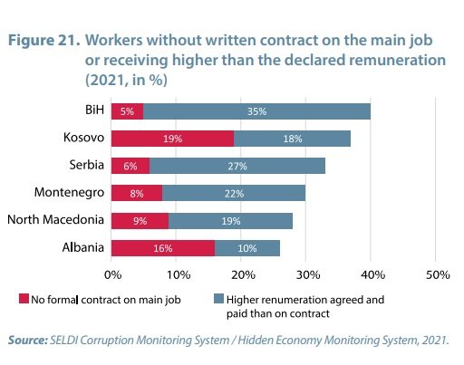 Në Serbi, vetëm 6 për qind e punonjësve nuk kishin kontratë të shkruar dhe 27% e tyre paguheshin më shumë se shuma e vendosur në kontratë, ndërsa në Bosnjë vetëm 5% e punonjësve nuk kishin një kontrate pune dhe 35% e tyre paguheshin më shumë se përcaktimet në kontratë.