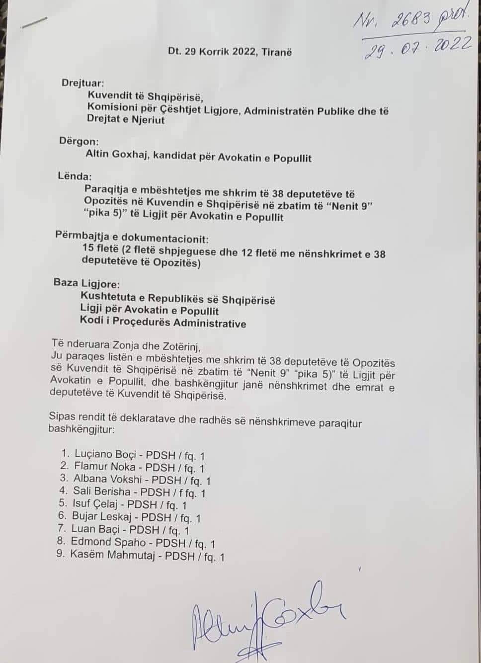 Goxhaj sqaron se kanditimi i tij është bërë në shkelje të procedurës ligjore dhe rregullores për të kandiduar për Avokat të Popullit.