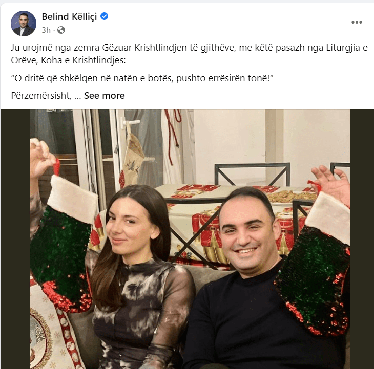 Në një postim në Facebook ku shfaqet bashkë me partneren e tij, Ana Shkreli, deputeti demokrat e bën urimin duke përdorur një pasazh nga Liturgjia e Orëve, një grup lutesh zyrtare që përdoren nga kisha në raste festash të shënuara.