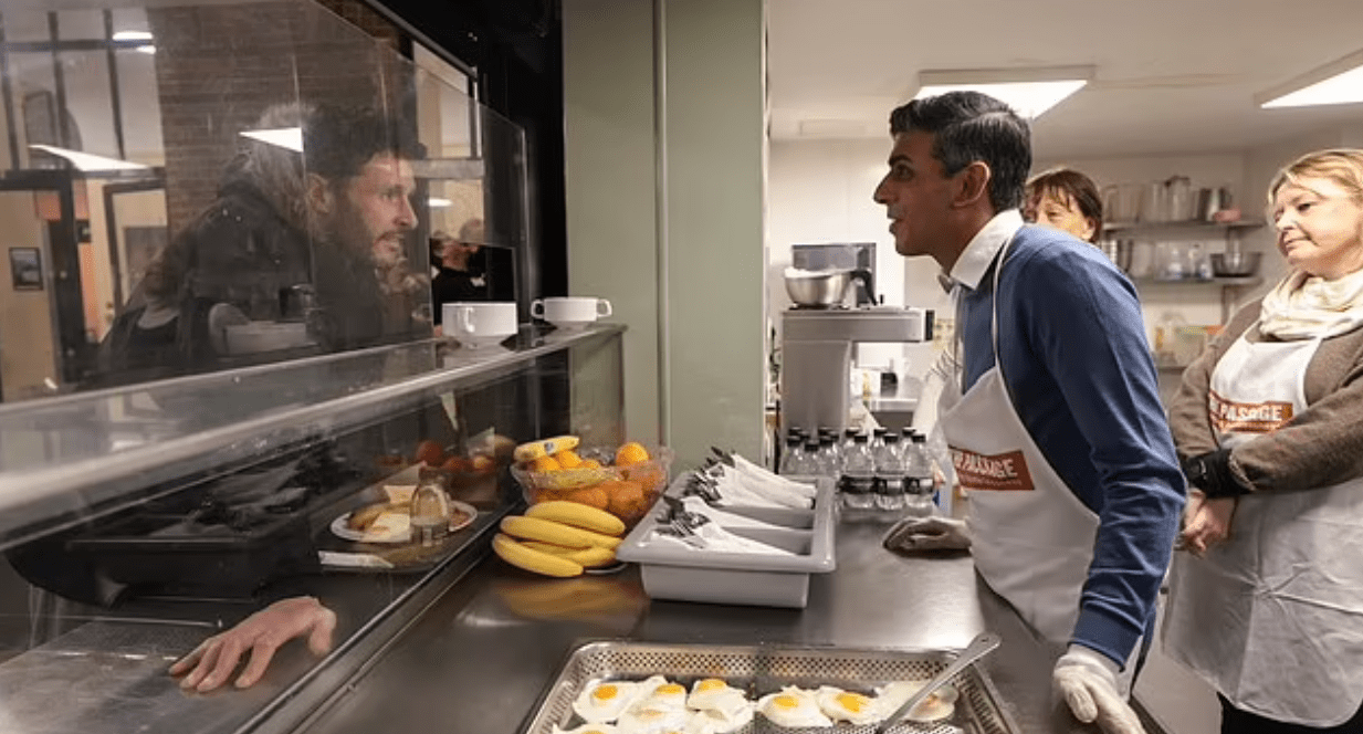 Rishi Sunak është kapur në çaste të sikletshme duke pyetur një të pastrehë nëse merrej me biznes, teksa shërbeu ushqim në një strehë përpara Krishtlindjeve.