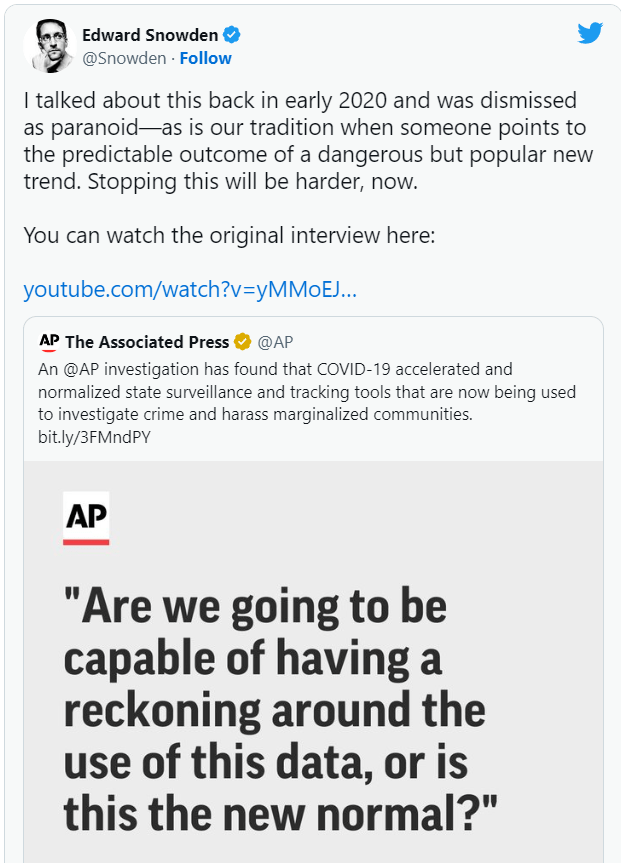 Ish-denoncuesi i CIA-s dhe i Agjencisë së Sigurisë Kombëtare, Edward Snowden, ka pretenduar shfajësimin pasi një raport i medias ekspozoi se si mjetet e mbikëqyrjes të përdorura për të luftuar Covid-19 tani po përdoren në mënyrë abusive nga forcat e rendit dhe autoritetet e tjera, siç parashikoi ai mbi dy vjet më parë.
