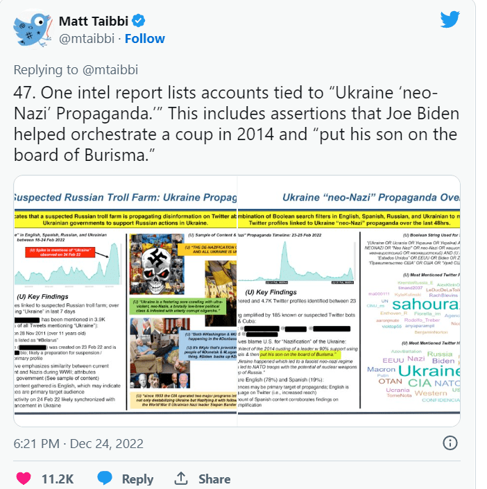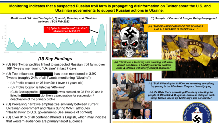 Një vlerësim tjetër i inteligjencës dërguar në Twitter pretendonte se llogaritë që përhapnin informacione për ‘neo-nazistët’ në Ukrainë ishin pjesë e një fushate propagandistike të kontrolluar nga Kremlini dhe duhet të ndaloheshin.