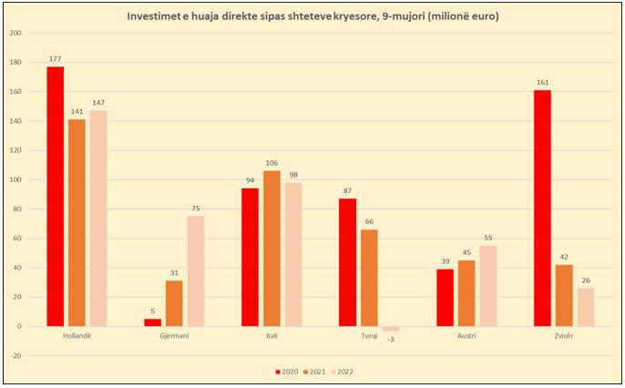 Sipas të dhënave nga Banka e Shqipërisë, investimet direkte holandeze në tremujorin e tretë të vitit arritën në 77 milionë euro, në rritje me 120% krahasuar me të njëjtën periudhë të vitit të kaluar. Ndërsa për gjithë 9-mujorin 2022 prekën vlerën e 147 milionë eurove, 4.2% më shumë krahasuar me të njëjtën periudhë të vitit të kaluar.