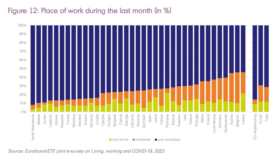Në Irlandë, 22 për qind e punonjësve punonin nga shtëpia në pranverë 2022dhe gati 25 për qind e me kombinim zyrë -shtëpi. Me tej Belgjika, Austria, Holanda, Gjermania dhe përgjithësisht vendet e BR vijojnë të kenë rreth 30 për qind të punonjësve që ushtrojnë punë në distance, ndërsa në vendet fqinjë me BE kjo përqindje është më e ulët rreth 12.