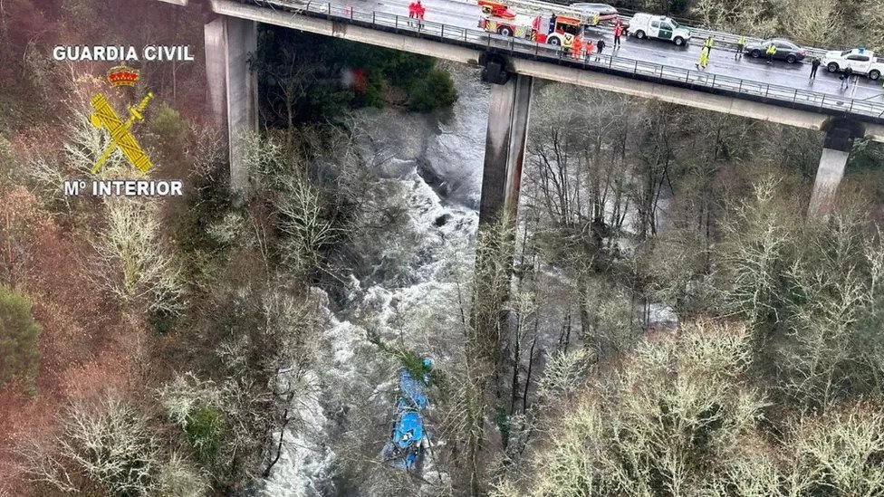 Dy persona, duke përfshirë shoferin, u lënduan pasi autobusi që udhëtonte nga Lugo në Vigo ra nga një lartësi prej rreth 30 metrash në lumë. Zyrtarët thonë se moti i keq mund të ketë shkaktuar aksidentin.