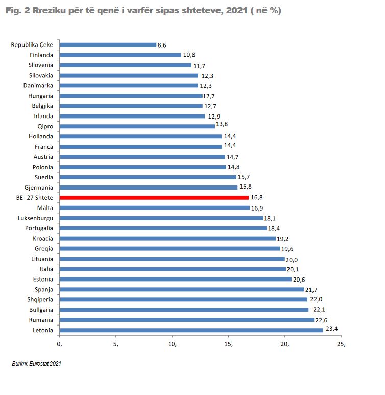 Krahasimi i rrezikut për të qenë i varfër për vitin 2021, ndërmjet Shqipërisë dhe vendeve të tjera të Rajonit dhe të Bashkimit Evropian tregojnë se: Vlera më e lartë e varfërisë relative shënohet në Letoni (23,4%), Rumani (22,6%), Bullgaria (22,1%) ndjekur nga Shqipëria (22%). Vlerat më të ulëta të varfërisë regjistrohen në Republikën Çeke (8,6%), Finlandë (10,8%), Sllovenia (11,7%), Sllovakia (12,3%) dhe Danimarka (12,3%). Mesatarja e vendeve të Bashkimit Evropian (27 shtete) është 16,8 %.