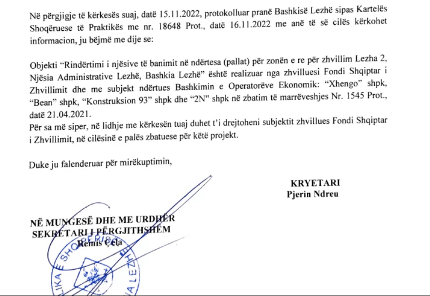 Për sa i përket shqetësimeve të ngritura nga qytetarët për Faktoje, Bashkia Lezhë na adresoi tek Fondi Shqiptar i Zhvillimit, pasi ky i fundit është pala zbatuese për projektin.