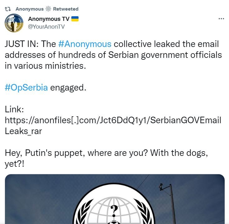Prej disa ditësh “Anonymous”, i ka shpallur “luftë” presidentit të Serbisë duke e quajtur atë si vegël të rusisë për të trazuar Ballkanin.