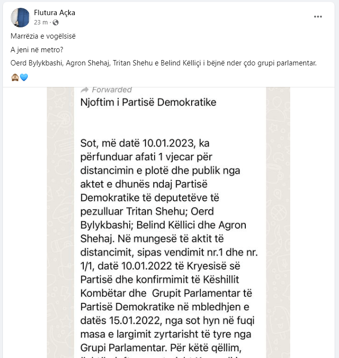 Deputetja e Partisë Demokratike, Flutura Açka ka reaguar pas përjashtimit nga Grupi Parlamentar i deputetëve Bylykbashi, Shehaj, Këlliçi dhe Shehu me një vendim të Kreut, Enkelejd Alibeaj.