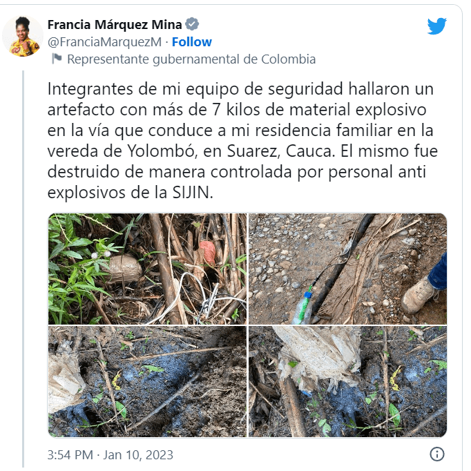 Pajisja u zbulua në një rrugë që të çon në shtëpinë e familjes së Marquez në fshatin Yolombo të hënën, shkroi zëvendëspresidentja në një postim në Tëitter. Agjentët e zbatimit të ligjit kryen një shpërthim të kontrolluar të pajisjes menjëherë pasi e gjetën atë, shtoi ajo.