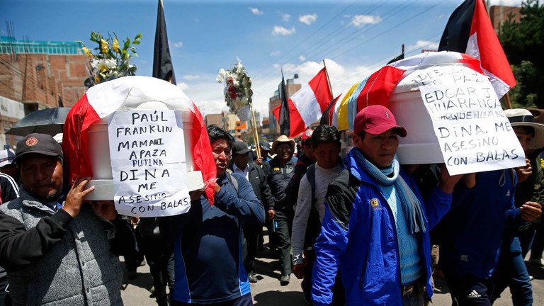 Në kortezhin e varrimit për të vdekurit të mërkurën, protestuesit dekoruan arkivolet e tyre me shënime të shkruara me dorë, duke deklaruar ‘Dina më vrau me plumba’, duke iu referuar presidentes në detyrë Dina Boluarte.