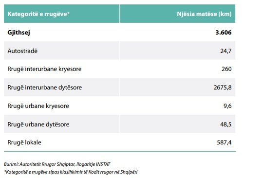 Sipas klasifikimit të INSTAT bazuar në kodin rrugor Shqipëria në vitin 2021 kishte vetëm 24.7 kilometër autostradë, 260 kilometër rrugë interurbane kryesore, 2675 kilometër rrugë interurbane dytësore, 9.6 kilometër rrugë urbane kryesore, 48.5 kilometër rrugë urbane dytësore dhe 597 kilometër rrugë lokale.