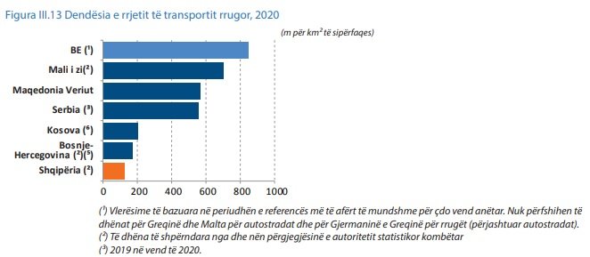 Me gjithë investimet në rritje në infrastrukturën rrugore, Shqipëria renditet si vendi me dendësinë më të ulët të rrjetit rrugor në Rajon.