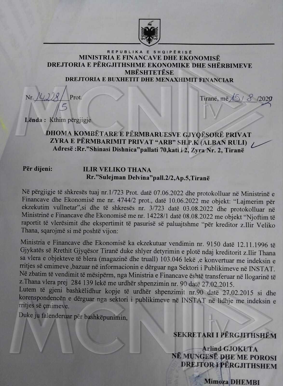 Thellohet skandali i aferës në Ministrinë e Financave. Gazetari i MCN TV Arsen Rusta mëson se Arlind Gjokutaj jo vetëm kishte dijeni për shlyerjen e detyrimit të Ilir Thanës, por më 15 gusht të vitit 2022 i përgjigjet zyrës përmbarimore, duke i thënë se kemi përfunduar këtë ekzekutim dhe praktikë të mbyllur.
