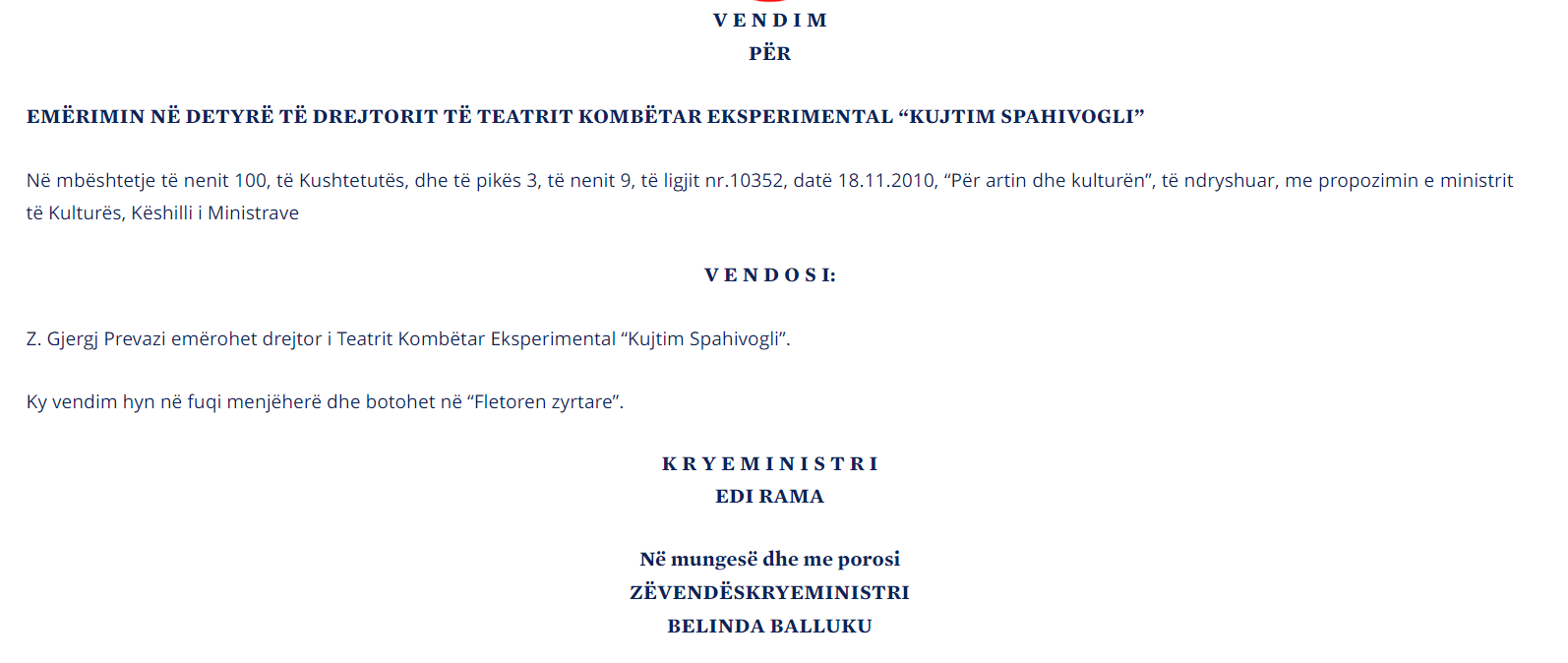Në mbledhjen e Këshillit të Ministrave të ditës së sotme, u vendos që Gjergj Prevazi të drejtojë këtë Teatër.