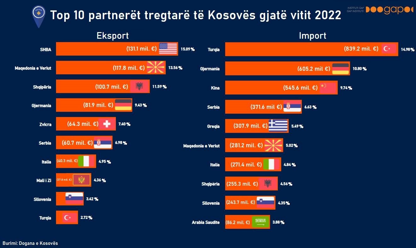 Në një grafikë, të cilën e ka publikuar Instituti GAP, janë renditur 10 vendet partnere të Kosovës në tregti për eksport dhe import.