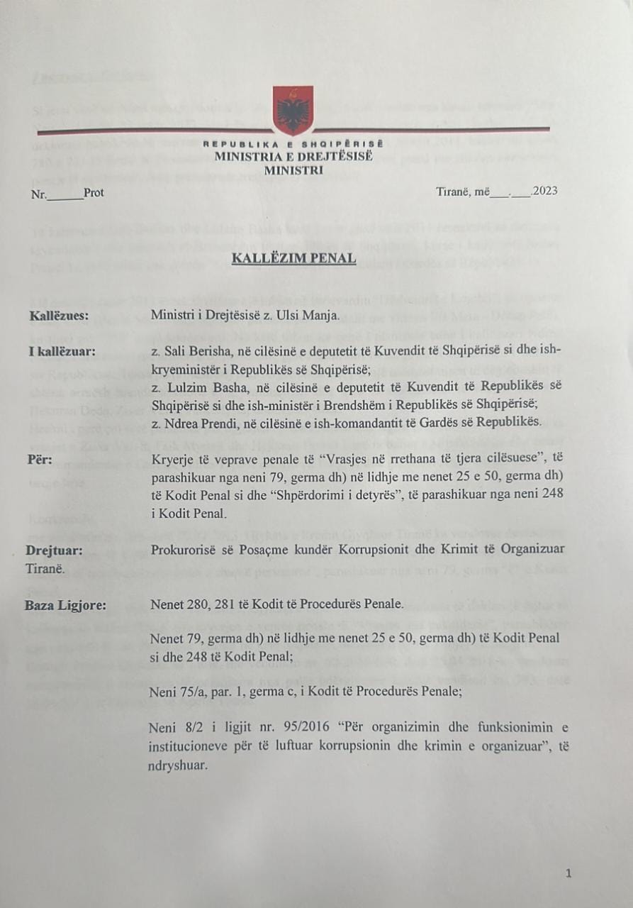 Në dokumentin e kallëyimit penal të Manjës, shihen emrat e Sali Berishës, në cilësinë e ish-kryeministrit, Lulzim Bashës si ish ministër i Brendshëm, dhe Ndrea Prendit ish komandat i Gardës.