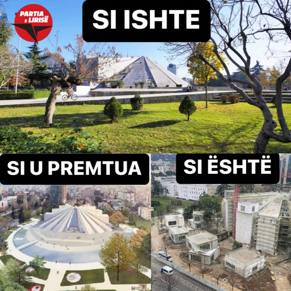 Në një postim në Facebook, Blushi me anë të krahasimit të disa fotove, tregon se asgjë nga ato që u premtuan se do bëheshin tek Piramida, nuk u bë dhe në vend të hapsirave të gjelbra, Veliaj ka ngritur mini kulla betoni.