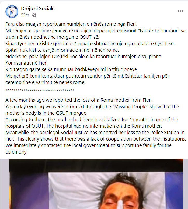 “Para disa muajsh raportuam humbjen e nënës rome nga Fieri. Mbrëmjen e djeshme jemi vënë në dijeni nëpërmjet emisionit “Njerëz të humbur” se trupi nënës ndodhet në morgun e QSUT-së. Sipas tyre nëna kishte qëndruar 4 muaj e shtruar në një nga spitalet e QSUT-së. Spitali nuk kishte asnjë informacion mbi nënën rome. Ndërkohë, paraligjori Drejtësi Sociale e ka raportuar humbjen e saj pranë Komisariatit në Fier. Kjo tregon qartë se ka munguar bashkëveprimi institucioneve. Menjëherë kemi kontaktuar pushtetin vendor për të mbështetur familjen për ceremoninë e varrimit të nënës rome.” – shkruan organizata në faqen e saj në Facebook.
