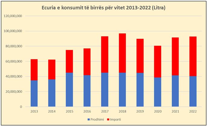 Për 2022 sipas të dhënave të Doganave prodhimi i birrës vendase u ul lehtë 2% në krahasim me 2021, ndërsa importet u rritën 4%. Pesha e importeve në konsumin e birrës për 2022 është 56% nga 44% që ishte rreth 1 dekadë më parë.
