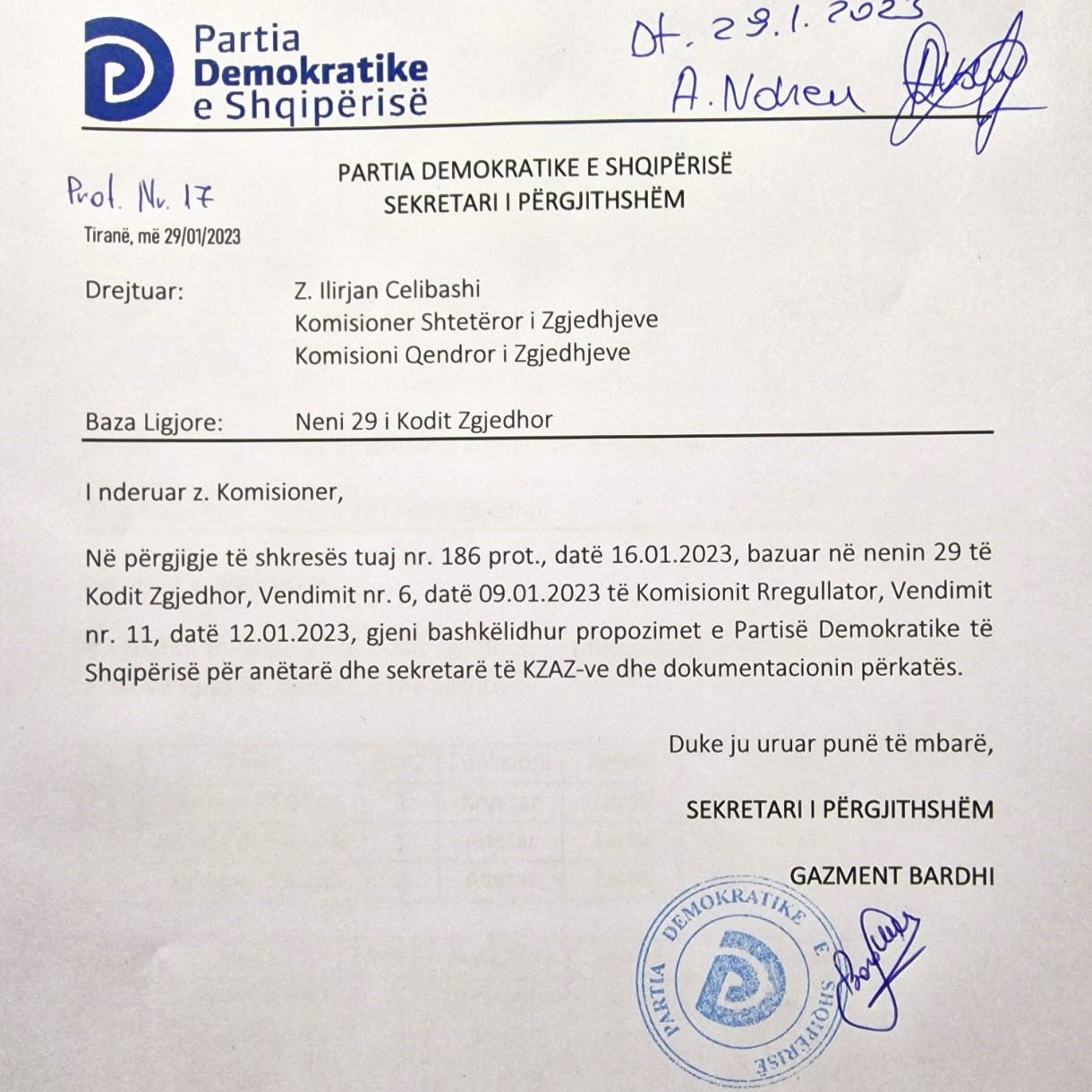 “Partia Demokratike dorëzoi sot listën e anëtarëve të KZAZ-ve për zgjedhjet e 14 Majit . Lista e plotë më anëtarët dhe sekretarët e KZAZ-ve u dorëzua pranë Komisionit Qëndror të Zgjedhjeve, nga Sekretari i Përgjithshëm i PD Gazment Bardhi”-thuhet në postimin e faqes të Partia Demokratike e Shqipërisë në Facebook.