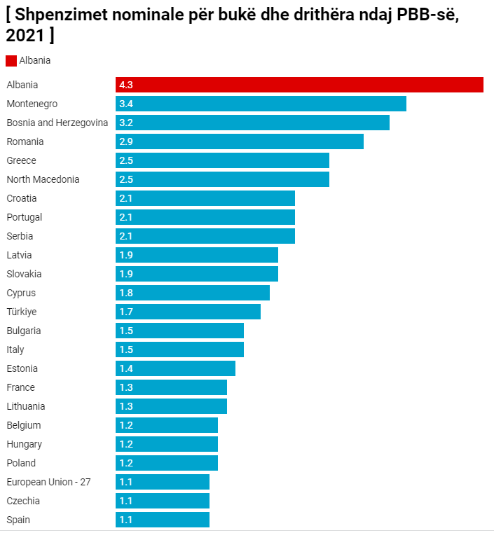 Në një tregues të varfërisë, shpenzimet nominale për bukë dhe drithëra për vitin 2021 ishin sa 4.3% e Prodhimit të Brendshëm Bruto (të ardhurat e ekonomisë në një vit), nga 1.1% që është mesatarja e Bashkimit Europian.