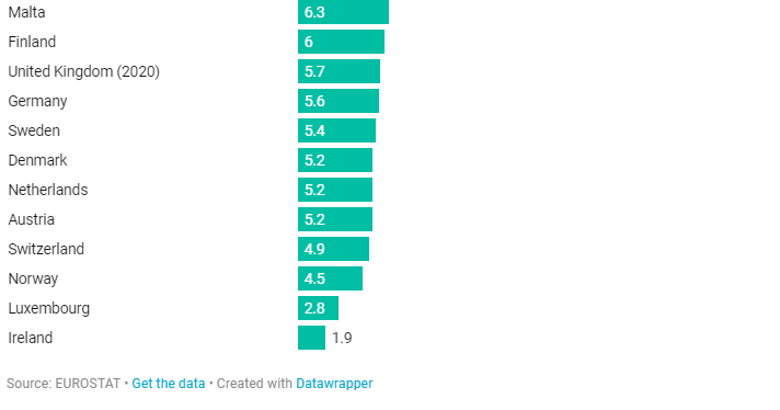 Në Europë, më pak për bukë e drithëra në raport me PBB-në shpenzojnë Danimarka, Suedia, Gjermania, Norvegjia, Finlanda, Zvicra etj, me më pak se 1% të PBB-së. (shiko grafikun: Shpenzimet nominale për bukë dhe drithëra ndaj PBB-së, 2021).