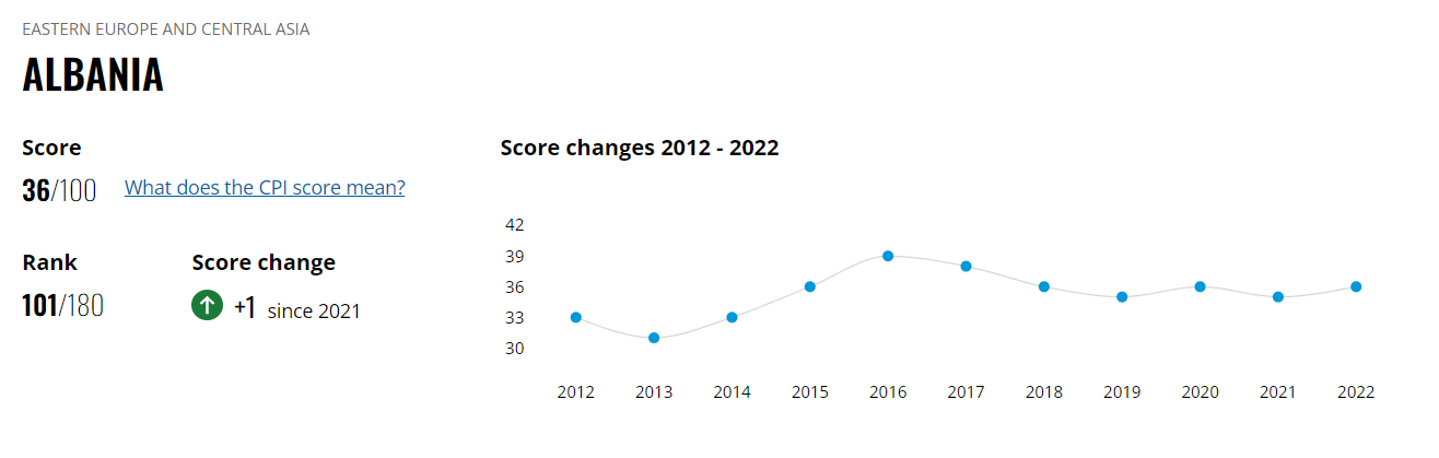 Shqipëria ka shënuar një përmirësim të lehtë në indeksin e korrupsionit për vitin 2022, sipas raportit të fundit të Transparency International, që mat perceptimin e korrupsionit në të gjithë botën, megjithatë ky përmirësim i lehtë nuk ka marrë vlerësim nga raporti.