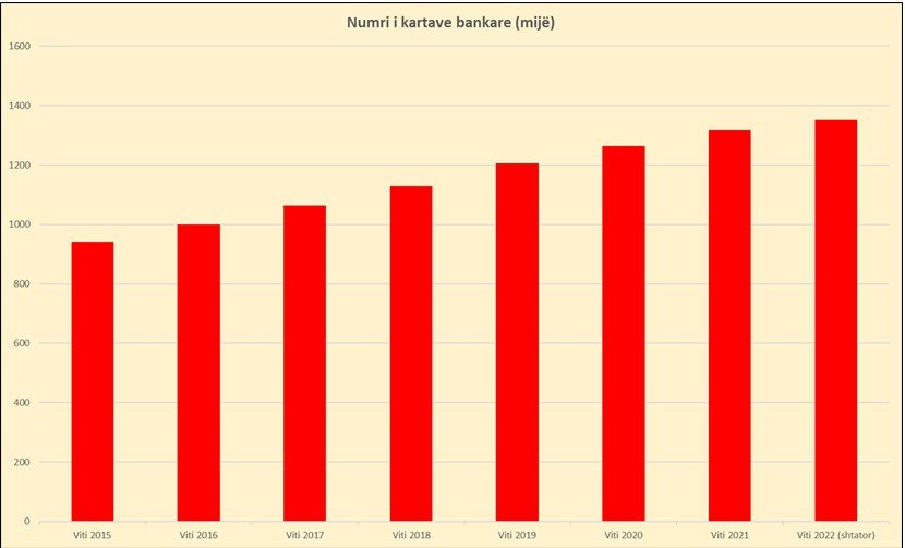 Sipas të dhënave nga Banka e Shqipërisë, në fund të muajit shtator 2022 numri i kartave bankare aktive arriti në 1.35 milionë, në rritje me 2.5% që nga fillimi i vitit. Rritja është mbështetur në masën dërrmuese nga zgjerimi i vazhdueshëm në segmentin më të madh atë të kartave të debitit, por edhe tendencat pozitive në produktin specifik të kartave me funksion paraje elektronike. Ndërkohë, kartat e kreditit vazhdojnë të shfaqin një ecuri në stanjacion, me një rritje shumë të vogël që nga fillimi i vitit.