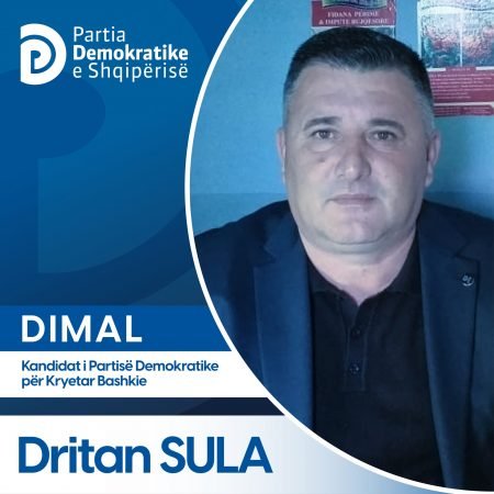 “Dritan Sula, kandidat i Partisë Demokratike për Kryetar Bashkie në Bashkinë Dimal. Sipërmarrësi Dritan Sula është tashmë zyrtarisht në garë për bashkinë e Dimalit, për të qenë ai qytetari i parë i kësaj bashkie. Sula, diplomuar në Universitetin Bujqësor të Tiranës, është një njeri aktiv në politikë dhe jetën e tij profesionale dhe shoqërore e ka të lidhur me vendlindjen e tij. Sula është aktiv në Partinë Demokratike që në vitin 1991, kur i’u bashkua lëvizjes antikomuniste për rrëzimin e diktaturës, për të vijuar më pas me themelimin e PD-së në vendlindjen e tij, deri në drejtimin e degës së saj, funksion të cilin e mban dhe sot. Dritan Sula me kandidimin e tij për bashkinë Dimal, synon që të jetë në shërbim të bashkëqytetarëve të vet, duke ofruar një projekt konkret, për të rikthyer Bashkinë tek qytetarët, të cilët gjatë qeverisjes së Rilindjes janë nëpërkëmbur e lënë në harresë nga bashkia.” – thuhet në njoftim.