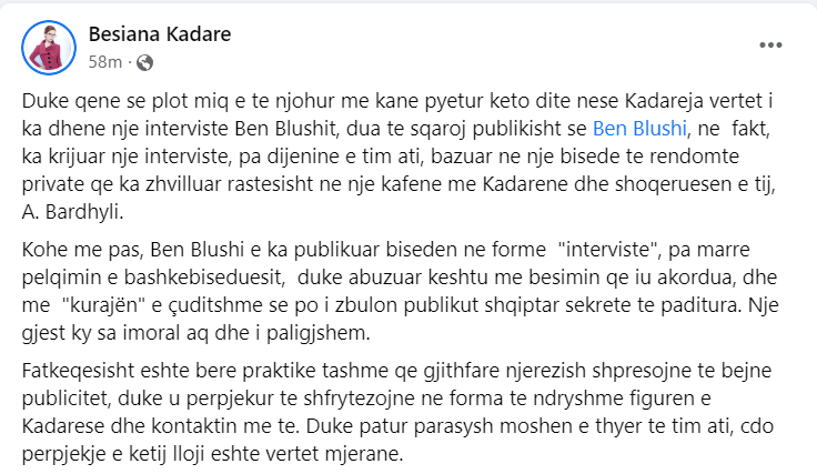 “Duke qene se plot miq e te njohur me kane pyetur keto dite nese Kadareja vertet i ka dhene nje interviste Ben Blushit, dua te sqaroj publikisht se Ben Blushi, ne fakt, ka krijuar nje interviste, pa dijenine e tim ati, bazuar ne nje bisede te rendomte private qe ka zhvilluar rastesisht ne nje kafene me Kadarene dhe shoqeruesen e tij, A. Bardhyli. Kohe me pas, Ben Blushi e ka publikuar biseden ne forme “interviste”, pa marre pelqimin e bashkebiseduesit, duke abuzuar keshtu me besimin qe iu akordua, dhe me “kurajën” e çuditshme se po i zbulon publikut shqiptar sekrete te paditura. Nje gjest ky sa imoral aq dhe i paligjshem. Fatkeqesisht eshte bere praktike tashme qe gjithfare njerezish shpresojne te bejne publicitet, duke u perpjekur te shfrytezojne ne forma te ndryshme figuren e Kadarese dhe kontaktin me te. Duke patur parasysh moshen e thyer te tim ati, cdo perpjekje e ketij lloji eshte vertet mjerane.” – shkruan Kadare.
