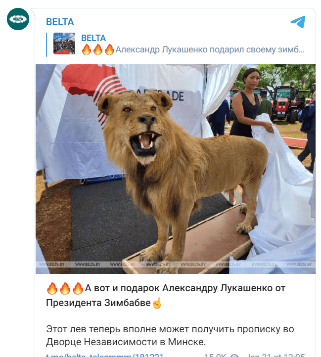 Mnangagwa, nga ana tjetër, i dhuroi Lukashenkos një luan të balsamosur. Sipas mediave bjelloruse, luani pritet të përfundojë në ekspozitë në pallatin presidencial në Minsk.