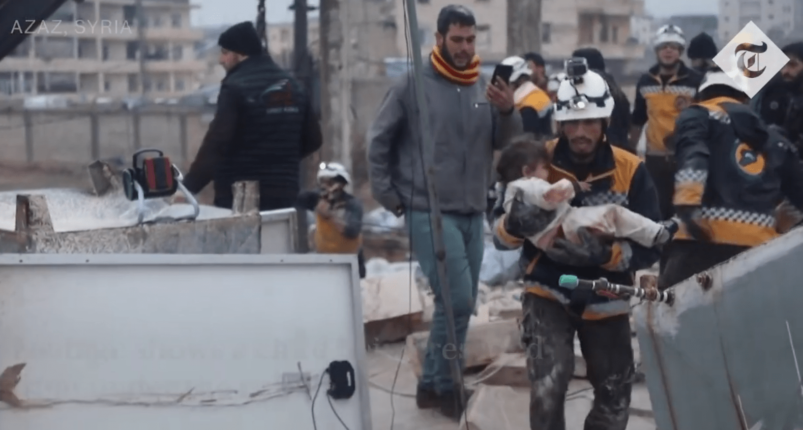 Një video e një fëmije të mitur që shpëtohet nga rrënojat e një godine të shkatërruar në Siri nga tërmeti i fuqishëm që goditi vendin e Turqinë është bërë virale.