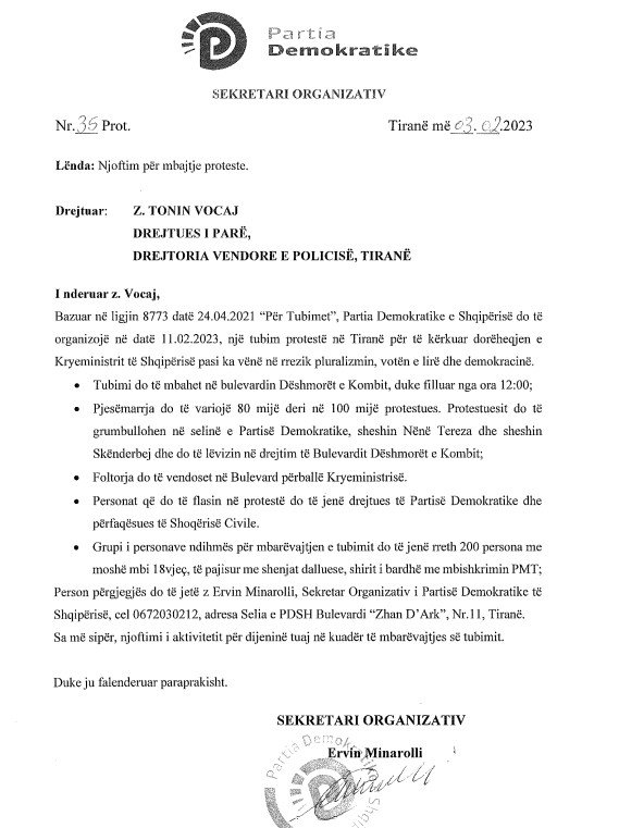 “Bazuar në ligjin 8773 datë 24.04.2021 “Për Tubimet”, Partia Demokratike e Shqipërisë do të organizojë në datë 11.02.2023, një tubim protestë në Tiranë për të kërkuar dorëheqjen e Kryeministrit të Shqipërisë pasi ka vënë në rrezik pluralizmin, votën e lirë dhe demokracinë. Tubimi do të mbahet në bulevardin Dëshmorët e Kombit, duke filluar nga ora 12:00;