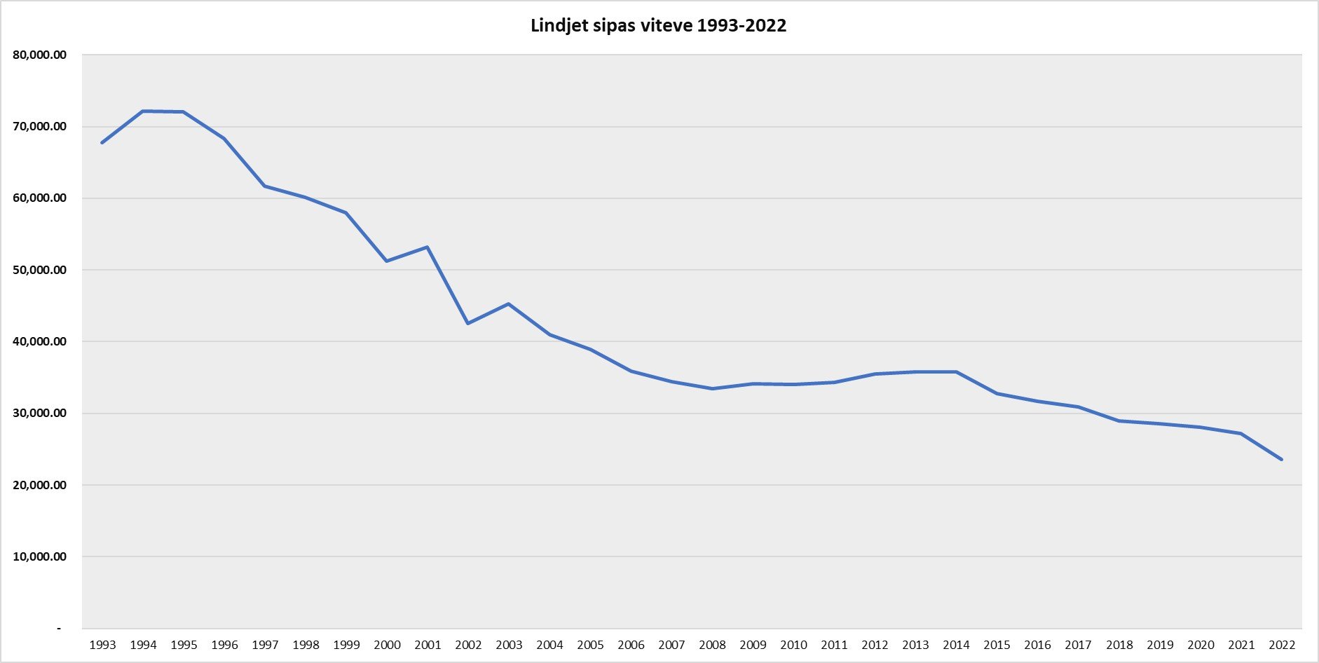 Numri i lindjeve në Shqipëri ka qenë i fortë, nga 67,7 mijë lindje në vitin 1993 në vetëm 23,500 të tilla në vitin 2022