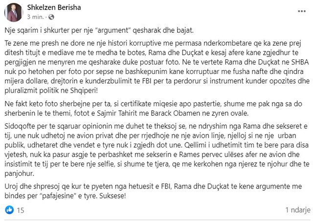 “Nje sqarim i shkurter per nje “argument” qesharak dhe bajat. Te zene me presh ne dore ne nje histori korruptive me permasa nderkombetare qe ka zene prej ditesh titujt e mediave me te medha te botes, Rama dhe Duçkat e kesaj afere kane zgjedhur te pergjigjen ne menyren me qesharake duke postuar foto. Ne te vertete Rama dhe Duçkat ne SHBA nuk po hetohen per foto por sepse ne bashkepunim kane korruptuar me fusha nafte dhe qindra mijera dollare, drejtorin e kunderzbulimit te FBI per ta perdorur si instrument kunder opozites dhe pluralizmit politik ne Shqiperi! Ne fakt keto foto sherbejne per ta, si certifikate miqesie apo pastertie, shume me pak nga sa do sherbenin le te themi, fotot e Sajmir Tahirit me Barack Obamen ne zyren ovale. Sidoqofte per te sqaruar opinionin me duhet te theksoj se, ne ndryshim nga Rama dhe sekseret e tij, une nuk udhetoj ne avion privat dhe per rrjedhoje ne nje avion linje, njelloj si ne nje urban publik, udhetaret dhe vendet e tyre nuk i zgjedh dot une. Qellimi i udhetimit tim te bere para disa vjetesh, nuk ka pasur asgje te perbashket me sekserin e Rames pervec ulëses afer ne avion dhe insistimit te tij per te bere nje selfie, si shume te tjera, qe me kerkohen nga njerez te njohur dhe te panjohur. Uroj dhe shpresoj qe kur te pyeten nga hetuesit e FBI, Rama dhe Duçkat te kene argumente me bindes per “pafajesine” e tyre. Suksese!” – shkruan Shkëlzen Berisha në Faebook.