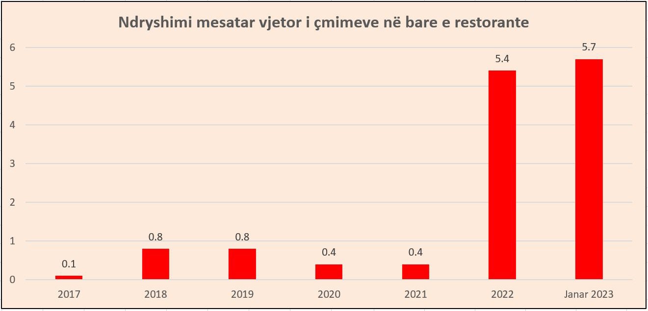 Rritja e fortë e çmimeve ka vijuar edhe për muajin janar 2023. Indeksi i çmimeve të konsumit në bare dhe restorante për janar 2023 është 5,7% nga 3% që ishte në janar 2022 (rritja 90%).