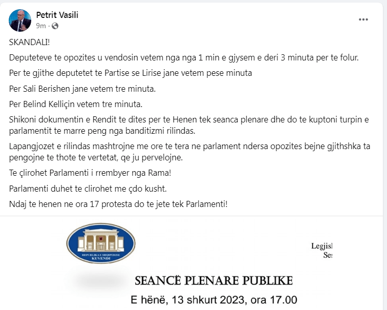 Deputeti i Partisë së Lirisë Petrit Vasili ka publikuar sot rendin e ditës për seancën e së hënës në parlament, duke e quajtur skandal minutazhin që iu është caktuar deputetëve të opozitës për të folur.